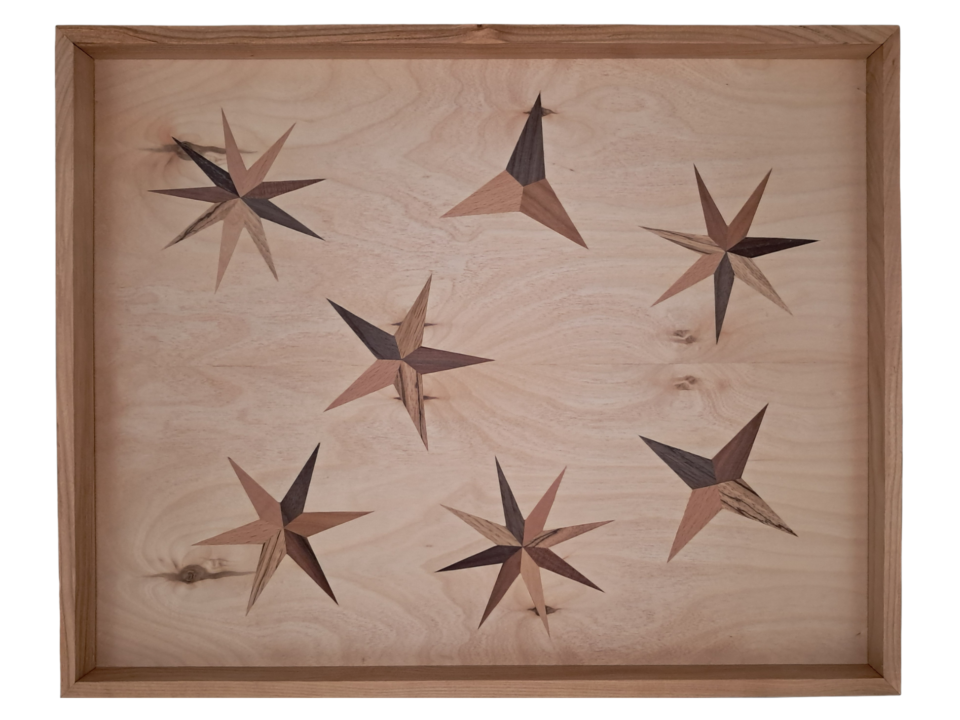 Grundfurnier in Birke. Motiv mit 7 Stern-Intarsien aus bunten Hölzern.